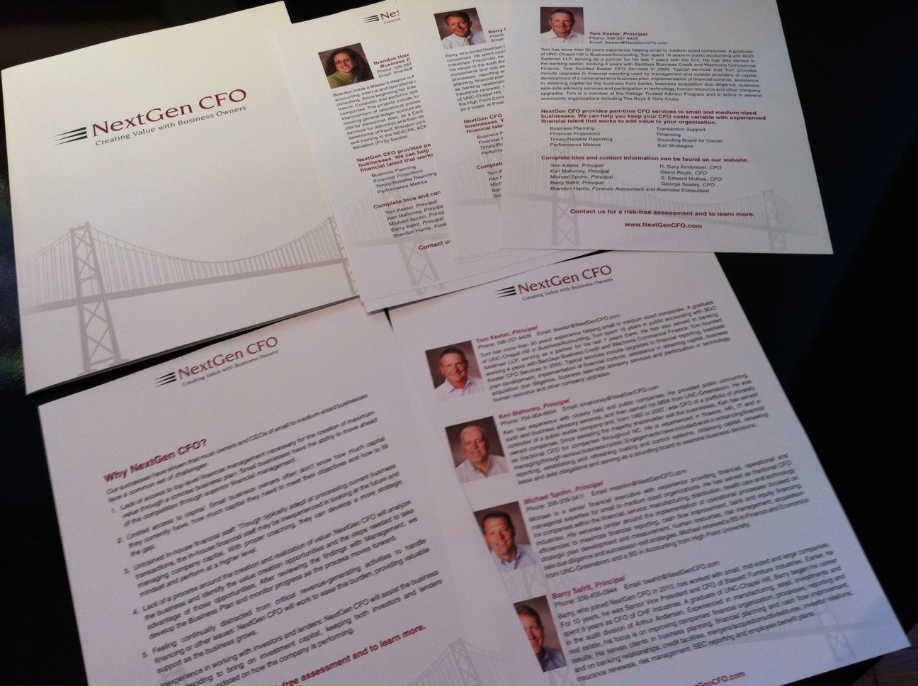 In working with a consortium of part-time CFO consultants, we were asked to create a series of sales materials. We first designed a pocket folder to function as the brand’s presentation wrapper.